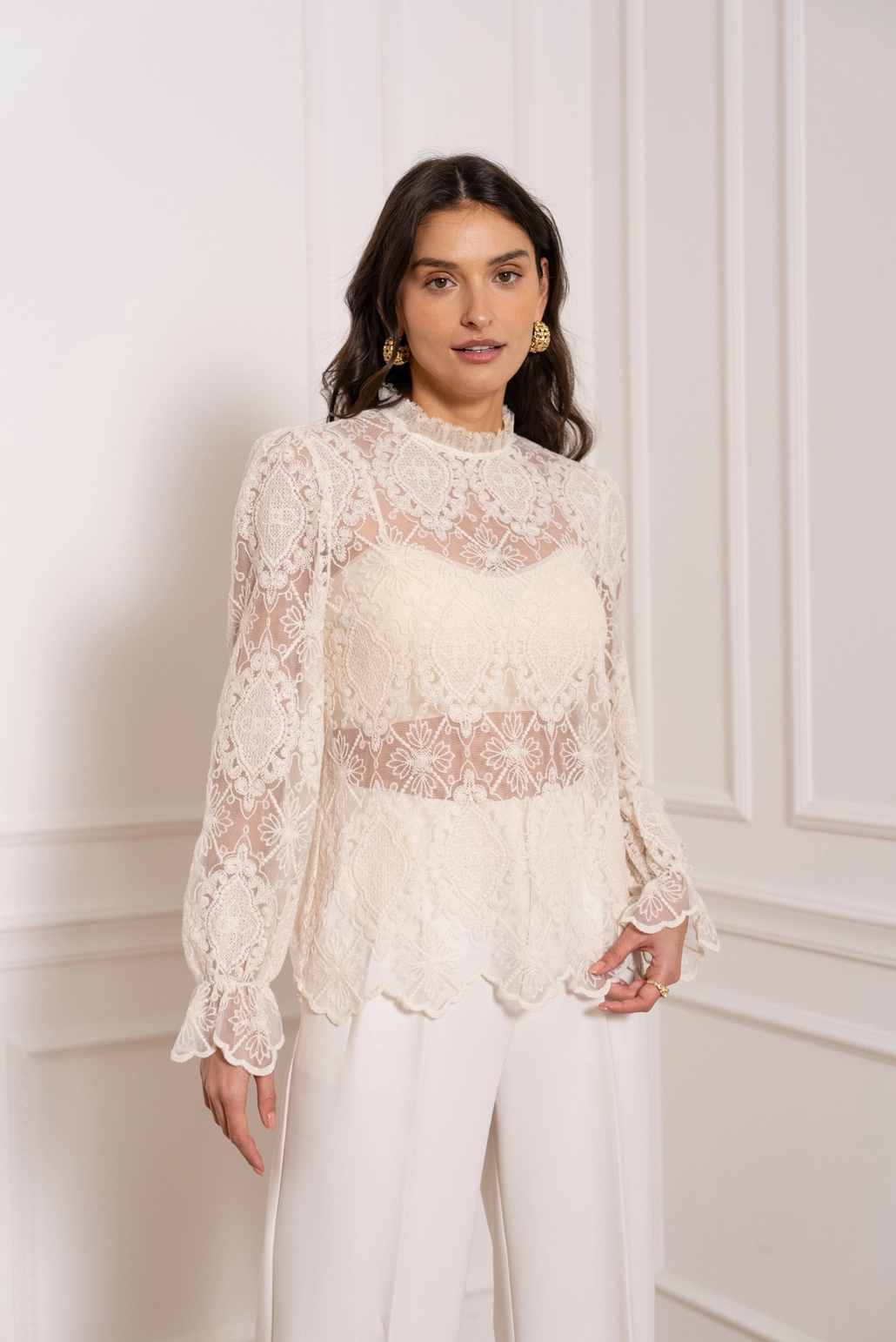 Vores delikate blondebluse er et raffineret stykke fuld af charme, der skaber en elegant silhuet. Let og luftig bluse med subtile detaljer: – Flydende og feminin pasform, perfekt til alle kropstyper – Høj krave, fint lavet for et sofistikeret og tidløst udtryk – Lange ærmer med en pæn og elegant afslutning – Rynkede manchetter, der tilfører volumen og bevægelse – Diskret åbning bagpå, lukket med en lille knap for nem påtagning – Fin blonderstof, blødt og let, for et romantisk og delikat look Når den bæres, udstråler den naturlig elegance og er ideel til et sofistikeret look eller et mere afslappet, men stadig raffineret outfit.
