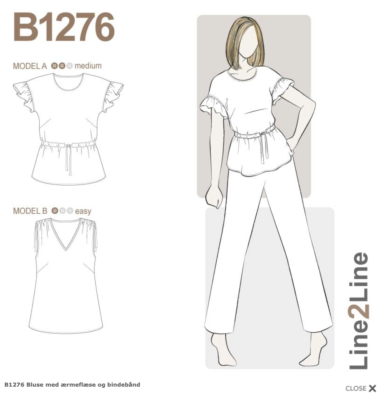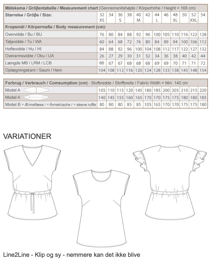 Line2Line snitmønster B1276 Bluse med ærmeflæse og bindebånd til fast stof. Mønsteret indeholder alle størrelser fra 32-54. Niveau: Medium / Easy. |