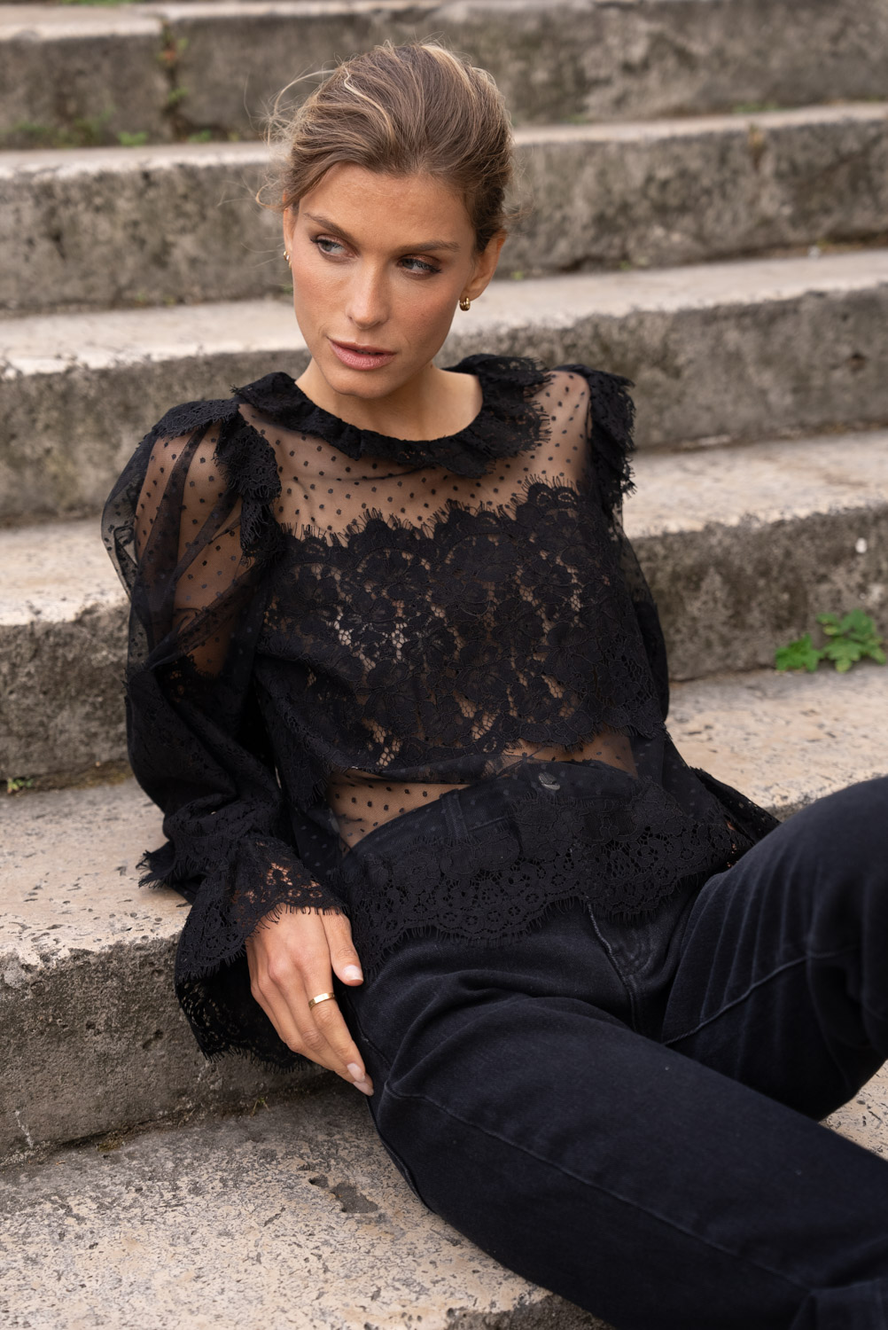 Lige og flydende snit – Klassisk skjortekrave – Lukning med knapper foran – Detaljer: Aftagelig lavallière-sløjfe i satinmousseline Knapmanchetter med læg for en subtil ballon-effekt Med sin delikate blonde og aftagelige lavallière-sløjfe fremkalder denne skjorte en femininitet, der både er dristig og poetisk. En ægte statement-piece fra præ-efterårskollektionen, der blander vintage-ånd med moderne raffinement. Bær den med højtaljede bukser for et selvsikkert look eller under en blazer for et sofistikeret udtryk. Takket være den aftagelige sløjfe kan du tilpasse din stil efter dine ønsker – chic og klassisk eller mere enkel.
