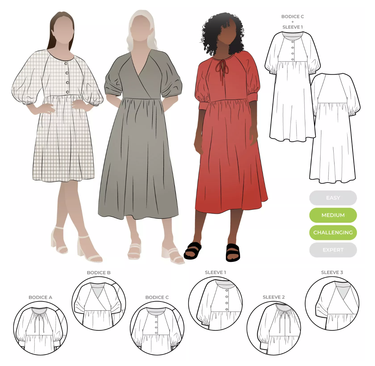 Giv din Hope Dress nyt liv med disse ekstra mønsterdele! Du får 3 overdele og 3 ærmemuligheder, der alle passer til skørtet fra det originale Hope Woven Dress-mønster. Det giver dig mulighed for at skabe over 9 forskellige udtryk med ét mønster. Bemærk, at skørtemønsteret ikke medfølger i denne pakke – du skal altså også have det oprindelige Hope Woven Dress-mønster.