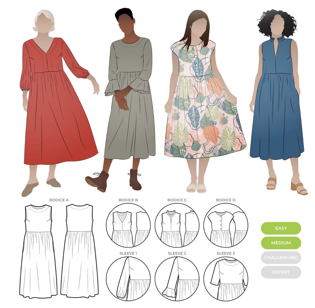 Forvandl din Montana-kjole med disse ekstra symønsterdele. Du får 4 overdele og 3 ærmevarianter, som er designet til at passe til nederdelen fra det originale Montana Midi Dress-mønster og giver mulighed for at skabe over 12 forskellige looks. Nederdelsmønsteret til Montana medfølger ikke i denne pakke, så du skal også bruge det originale Montana Midi Dress-mønster.