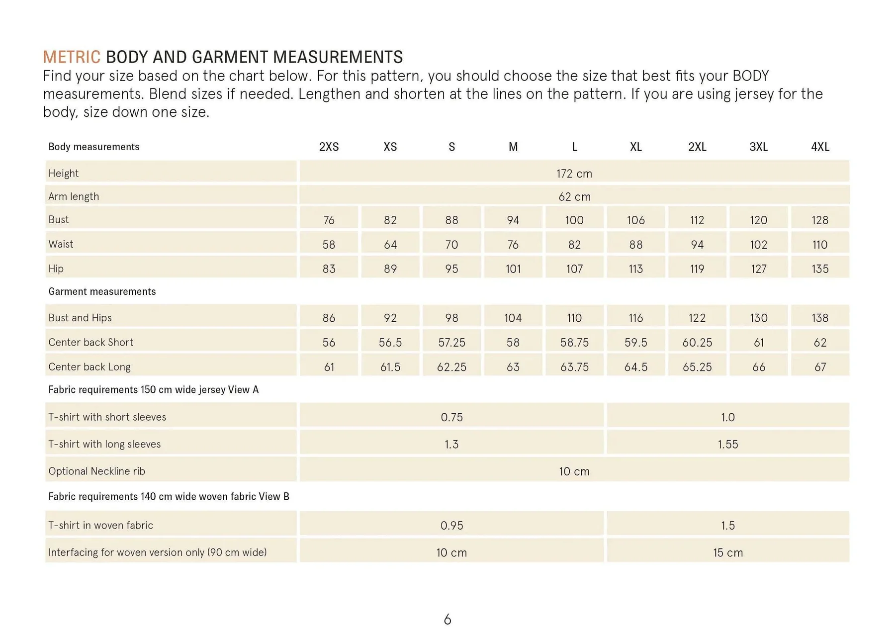 Dette alsidige Easy T-Shirt-mønster har en afslappet pasform med Dolman-ærmer. Mønstret indeholder to længdevarianter og to halsudskæringsstile – enten med halskant eller belægning. Sy T-shirten i jerseystof og vælg mellem korte eller lange ærmer.